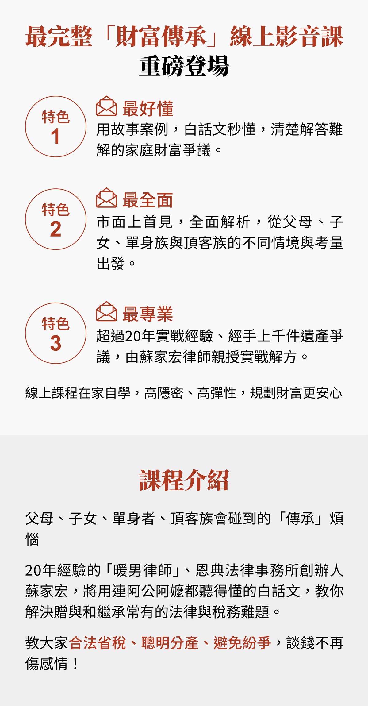 不再讓財富成為家庭爭端的導火線。《全方位財富傳承攻略》系列課程,由「財富傳承專家」蘇家宏律師,針對人生四大角色——父母、子女、單身、頂客族,提供最全面的解答。從根本釐清法律權益、掌握遺囑主導權,到學會聰明節稅,一套完整解方,終結所有世代「難以啟齒」的金錢煩惱,實現不爭不搶,財富永流傳。