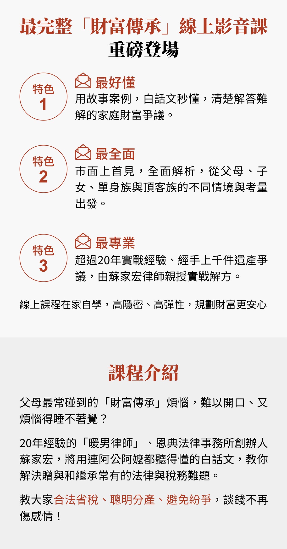 父母辛苦打拼一輩子的資產,無非是希望能妥善傳承給子女,成就一個「留愛不留爭」的圓滿結局。 然而,多數父母最大的焦慮,是擔心太早分產導致子女不孝、讓自己缺乏保障,或分配不均引發手足反目。「財富傳承專家」蘇家宏指出,遺囑正是承載這份愛的最佳工具!這堂課將教您如何運用遺囑掌握主導權、搭配信託及節稅技巧,幫助您妥善規劃,讓愛不留遺憾。