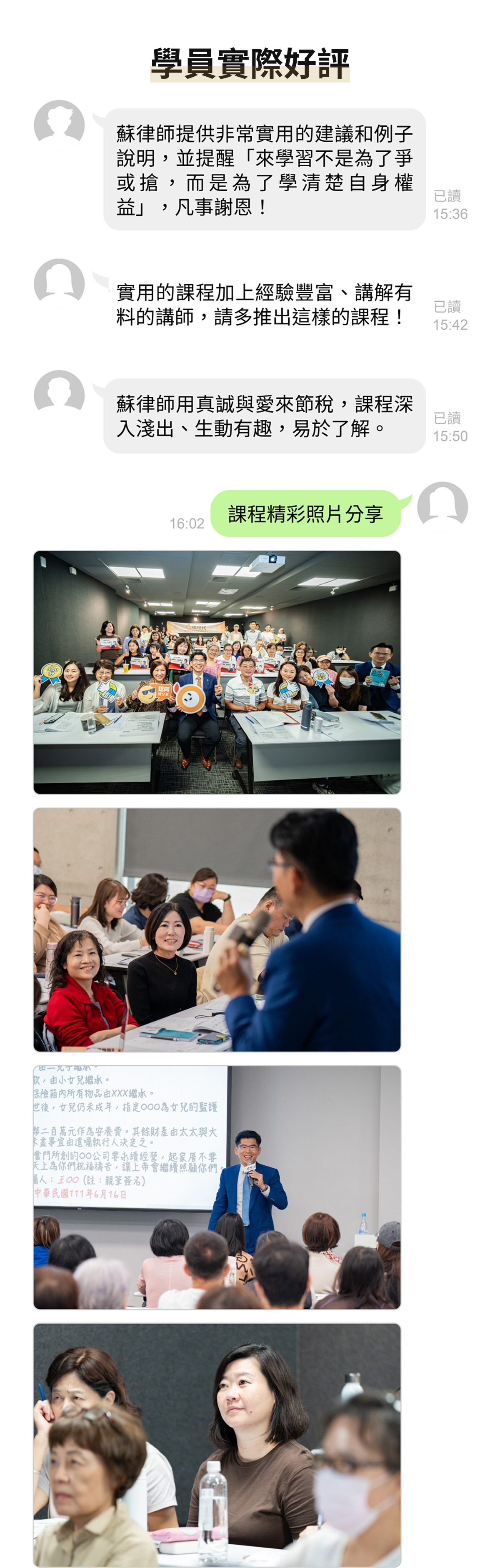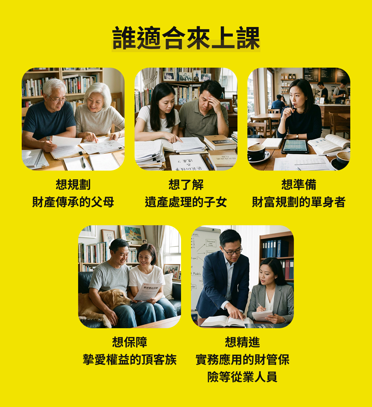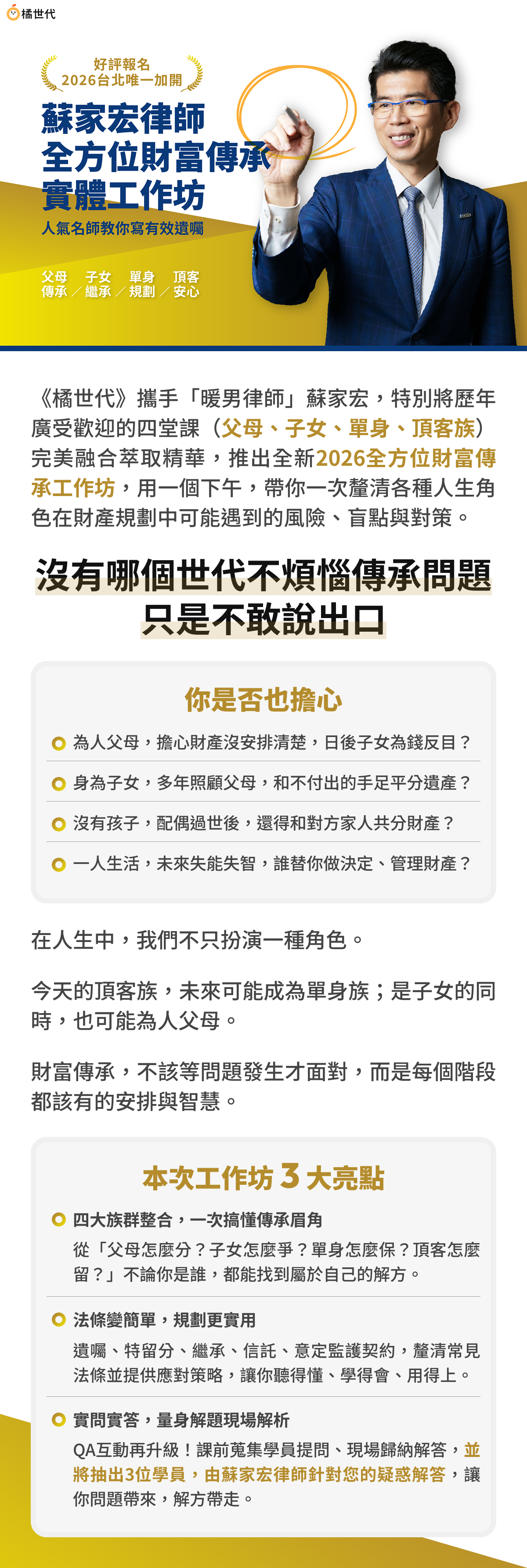 2026年全新升級,由「財富傳承大師」蘇家宏律師親授,一個下午、四大主題,一次破解你最關心的傳承難題!不論你是為人父母、身為子女、單身一人,或是無子女的頂客族,這堂課都將提供你最實用的法規解析與策略建議。財產怎麼分?遺囑怎麼寫?什麼是特留分?什麼情況該用信託、意定監護契約?從釐清權益、掌握主導權,到學會節稅與保障自己,一次理解傳承全局。別讓愛措手不及,提前準備為自己與家人做出最穩妥的安排。
