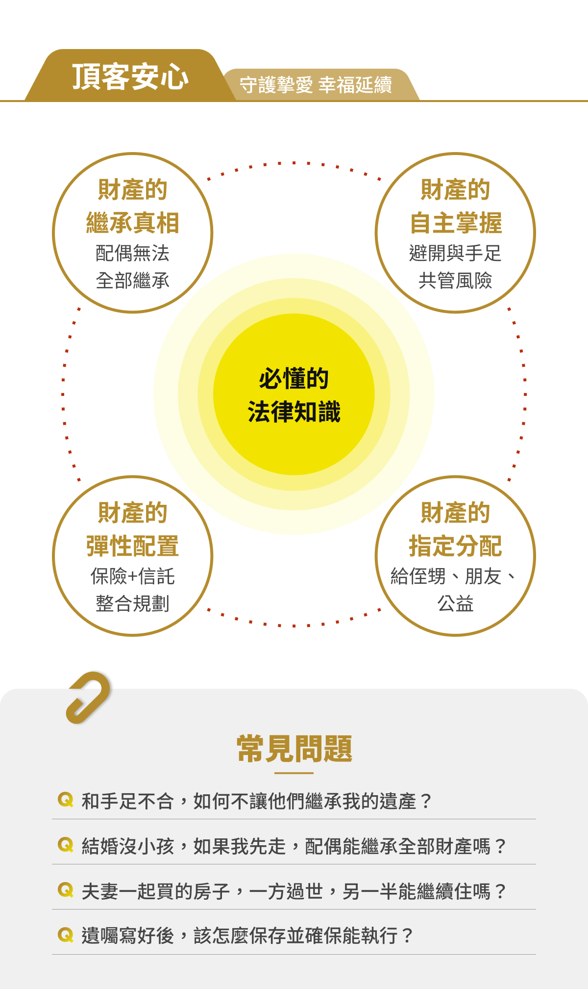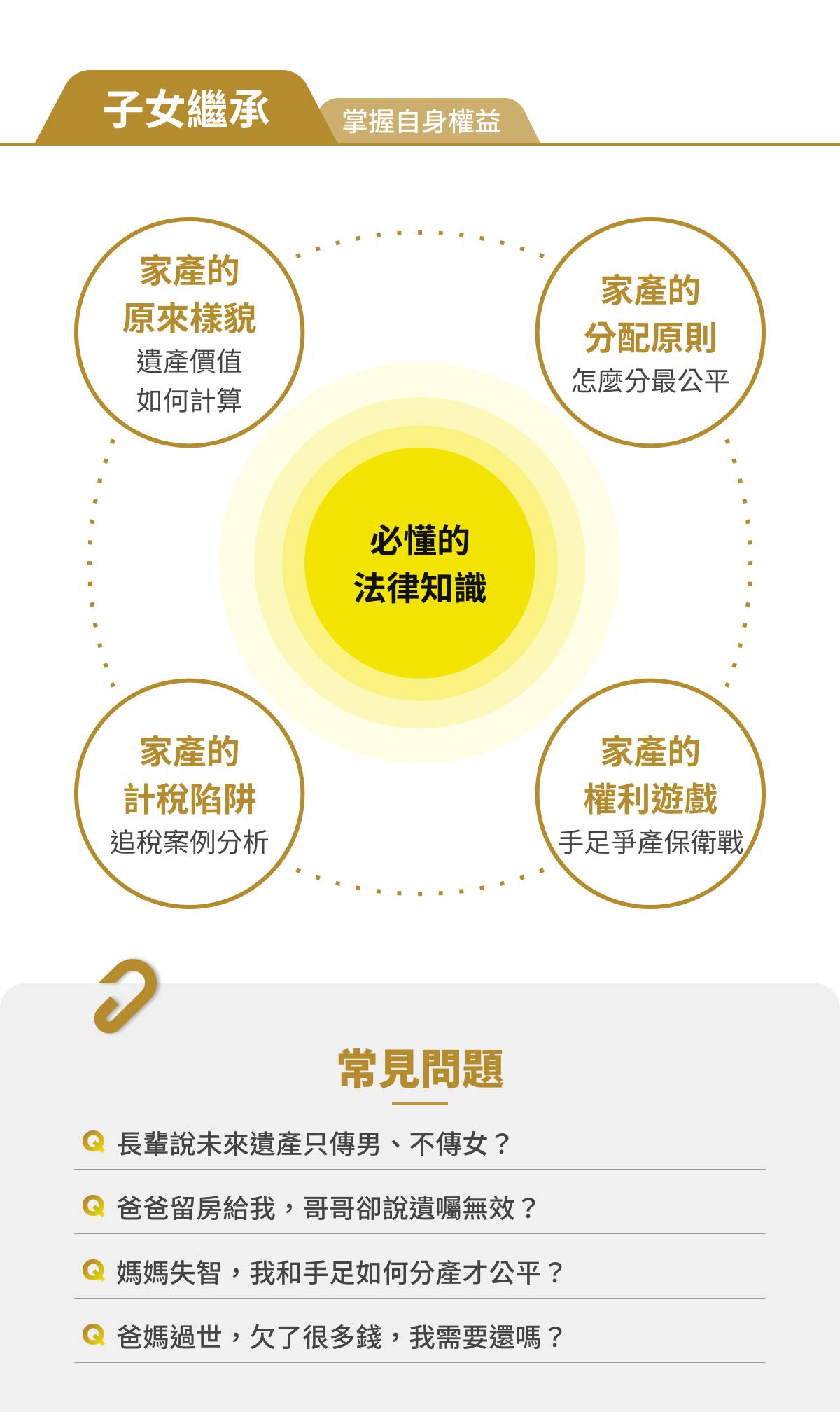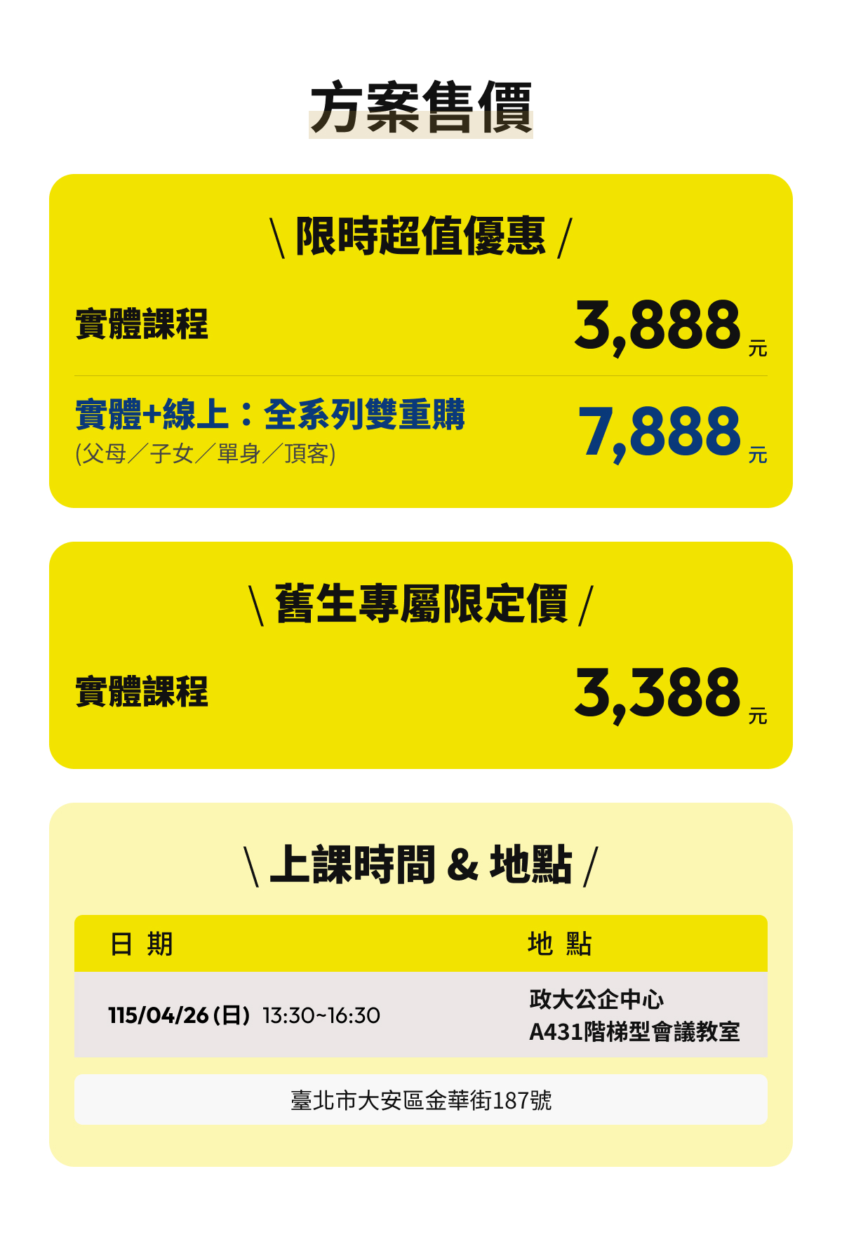 2026年全新升級,由「財富傳承大師」蘇家宏律師親授,一個下午、四大主題,一次破解你最關心的傳承難題!不論你是為人父母、身為子女、單身一人,或是無子女的頂客族,這堂課都將提供你最實用的法規解析與策略建議。財產怎麼分?遺囑怎麼寫?什麼是特留分?什麼情況該用信託、意定監護契約?從釐清權益、掌握主導權,到學會節稅與保障自己,一次理解傳承全局。別讓愛措手不及,提前準備為自己與家人做出最穩妥的安排。