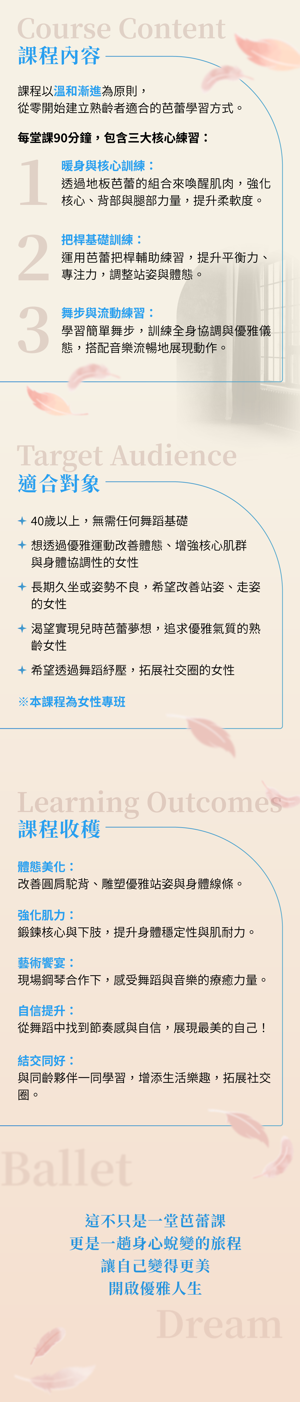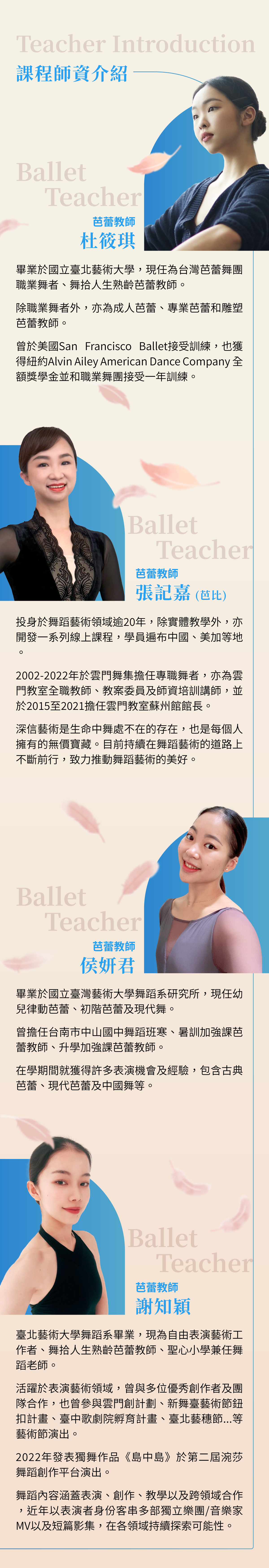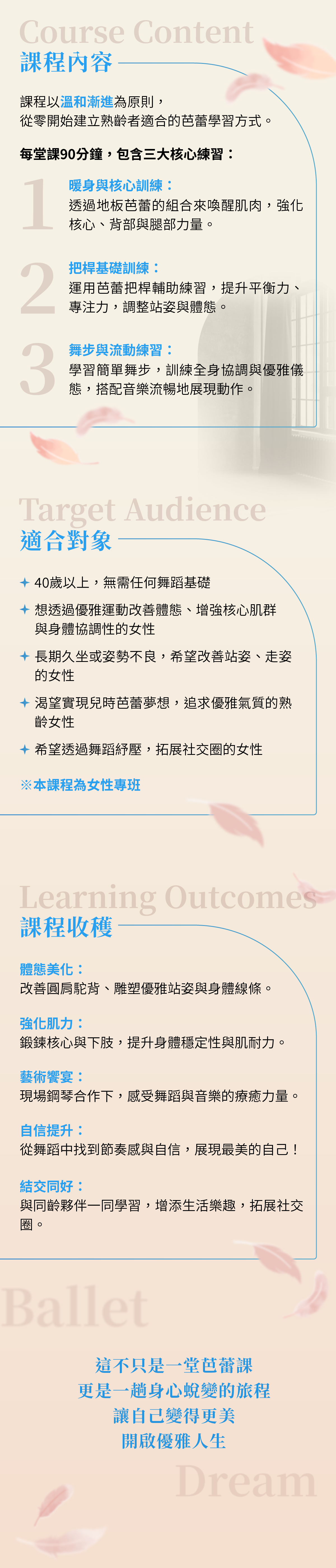 「每個女人心中,都曾住著一個穿著舞裙旋轉的女孩。」 你曾嚮往優雅的芭蕾姿態,卻因年齡或身體僵硬而卻步嗎?其實,芭蕾並非年輕人的專利!這堂專為40歲以上女性打造的《熟齡芭蕾入門課》,讓你無需舞蹈基礎,也能輕鬆踏入芭蕾的優雅世界,透過溫和的訓練調整體態、增強平衡感,找回身心的自信與美感!