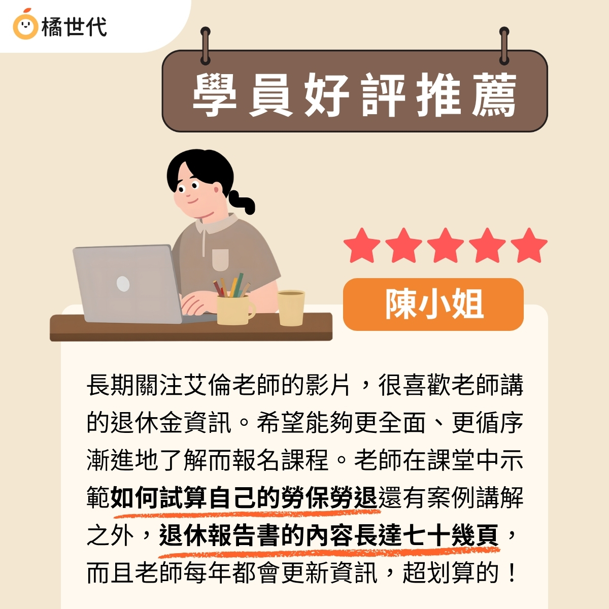 課程結束後,報告書也能作為日後查閱與規劃退休的重要參考工具。此外,報告書內容將每年更新一次,補充最新勞保與勞退制度與數據,讓學員能持續掌握制度變化。