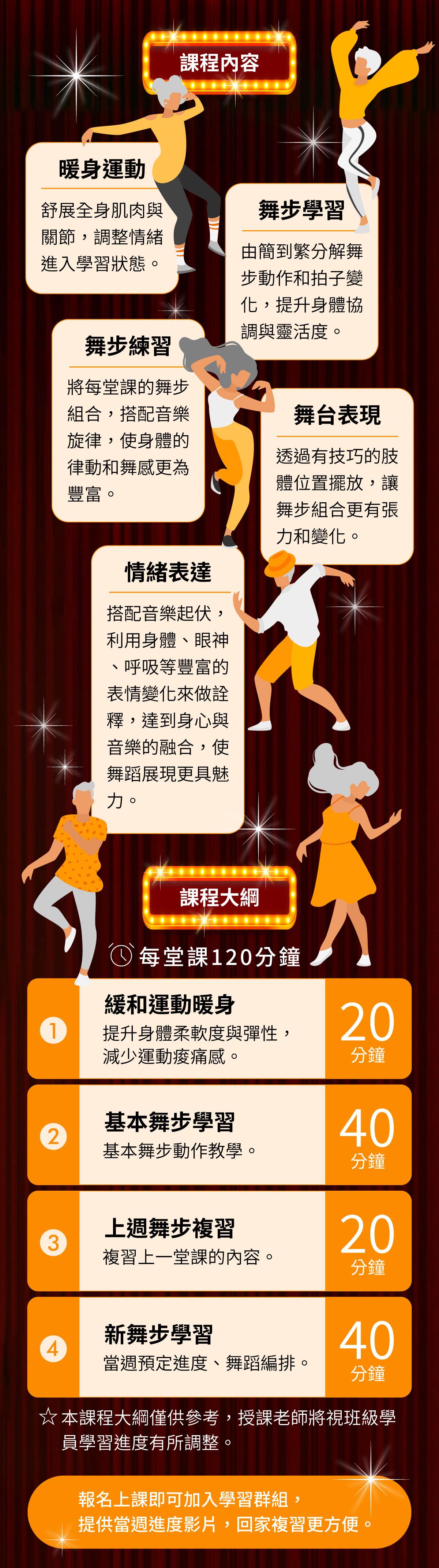 其他人也買了… │ 課程特色 1. 簡易好上手,不需舞蹈基礎,也能享受跳舞的樂趣2. 跳舞能促進新陳代謝,增強身體的協調性和靈活性3. 變化性的舞步,可幫助活化大腦4. 沉浸在百老匯的歡樂音樂,轉換心情,培養新興趣5. 結交新朋友,共享時代回憶6. 學習群組提供當週進度影片,回家複習更方便7. 活動、聚會或尾牙的表演展現