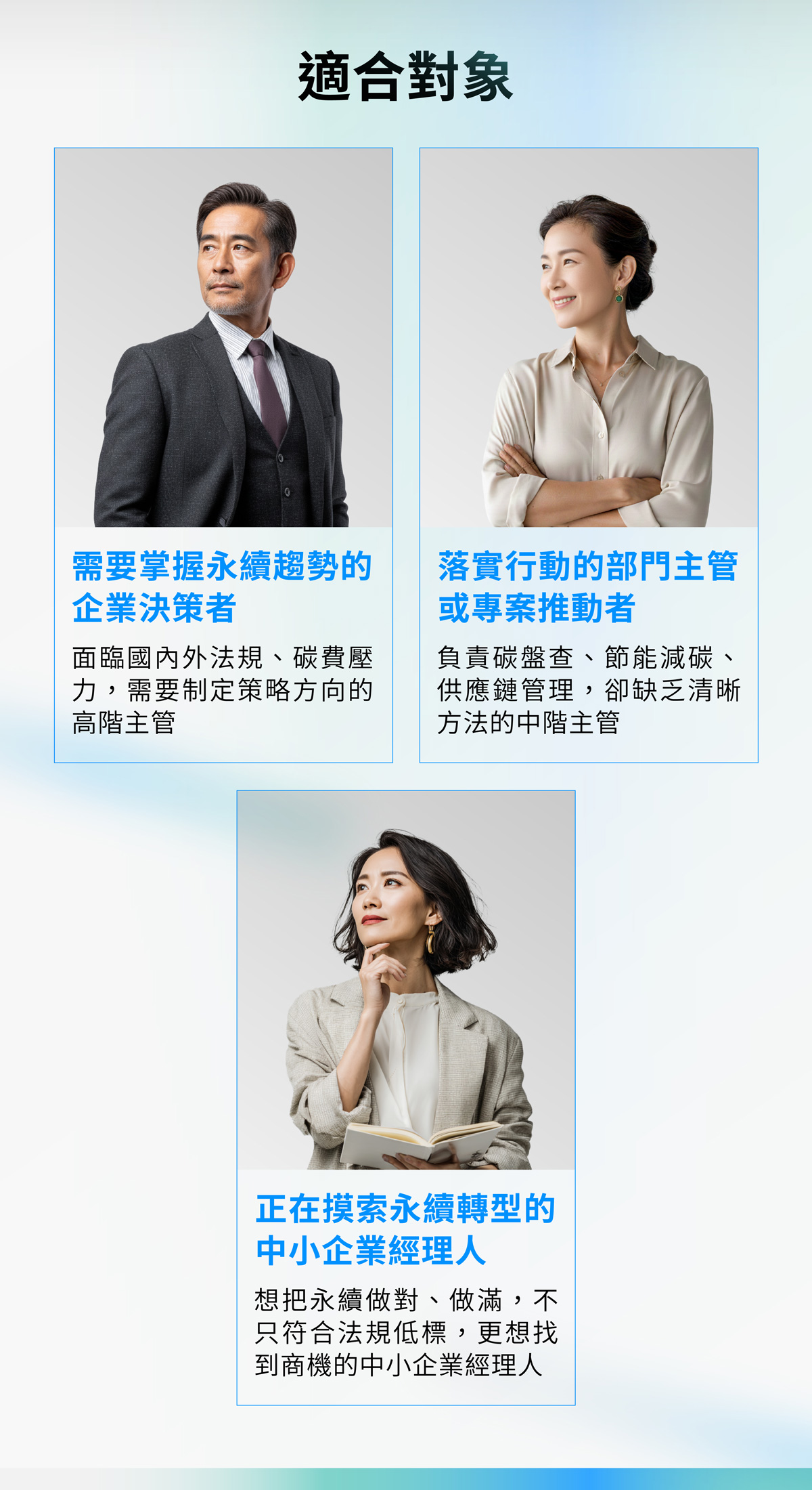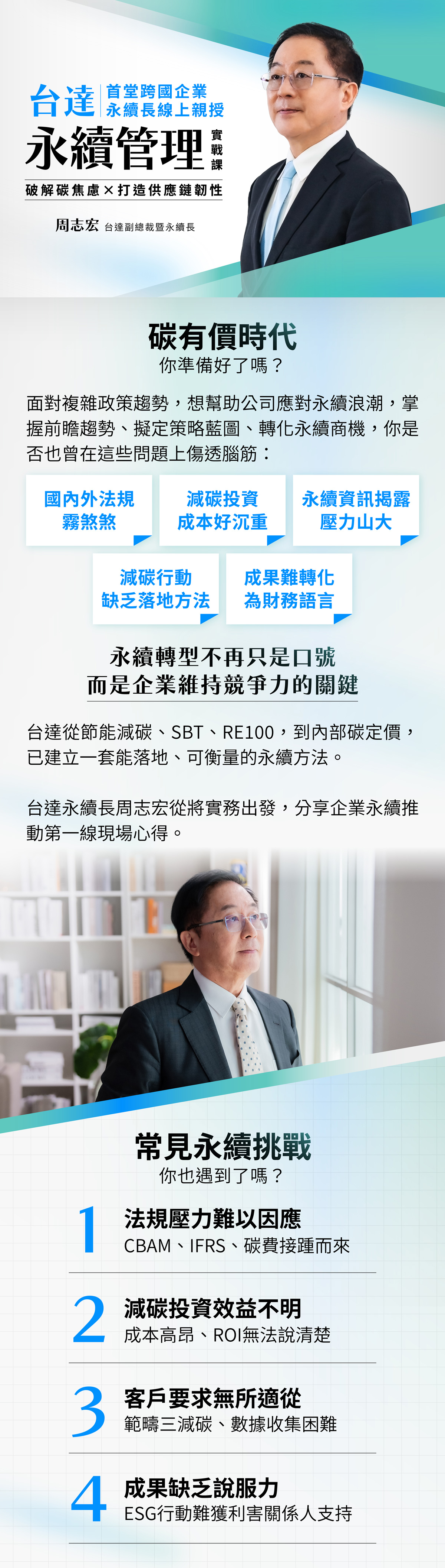 碳有價時代,永續不再是口號,而是攸關企業成本與競爭力的現實。歐盟CBAM碳關稅開徵、IFRS明訂永續揭露準則、台灣碳費制度上路,企業若缺乏永續管理思維,將難以掌握成本與市場話語權。 台達從節能減碳、SBT、RE100,到內部碳定價,已建立一套能落地、可衡量的永續方法。台達永續長周志宏將從實務出發,分享企業永續推動第一線現場心得。 無論您是正在摸索的企業經理人、還是已經開始行動的執行者,都能從這門課學會適合的方法、路徑與框架,讓永續真正成為競爭力。